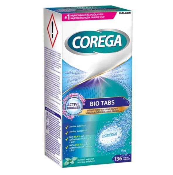 Čistící tablety COREGA BIO TABS pro celkové zubní náhrady a jednoduché, částečné snímatelné náhrady.