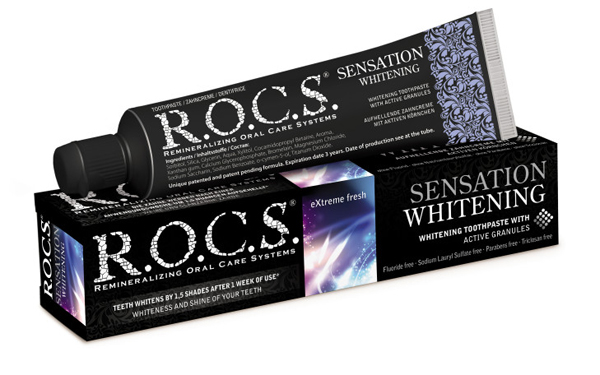 Zubní pasta R.O.C.S.® Sensation whitening bělí zuby bezpečně a účinně.