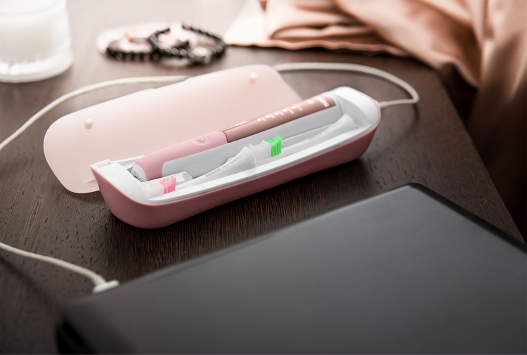Elegantní v koupelně, i na cestách. Nabíjí se a při denním užití - vydrží čistit až 6,5 týdne. Vyjímečné cestovní pouzdro se zabudovaným UV světla ke sterilizaci hlavic má USB konektor, který se dokáže kartáček nabít např. přes notebook, powerbank, ale i klasickým, nabíjecím kabelem. Do cestovního pouzdra se vejdou i dvě výměnné hlavice, případně jedna hlavice a menší zubní pasta.