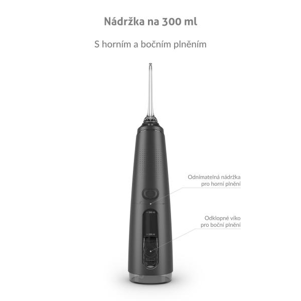 Nádržka o objemu 300 ml vystačí na vyčištění celého chrupu a zároveň je dostatečně kompaktní. Kromě obyčejné vody jí můžete naplnit ústní vodou pro extra svěžest.