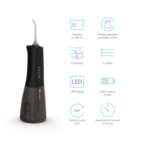 Mezizubní prostory bývají rájem bakterií, které jsou příčinou zubních kazů. Nejúčinněji se jich zbavíme každodenním čištěním nejen zubů, ale právě i prostoru mezi nimi. Speciální kartáčky či zubní nitě nemusejí být zrovna komfortní a jejich neustálé nakupování pociťuje naše peněženka. Šetrnější řešení ve všech směrech představuje ústní sprcha TrueLife AquaFloss Compact L100 Black disponující 3 režimy čištění, především režimem POINT, který cíleně a účinně odstraní zbytky jídla z mezizubních prostor. 300ml nádržka s dvojitým plněním, shora i z boku, pohodlně vystačí na dvouminutové čištění, které hlídá integrovaný časovač. Praktické je pak plnění nádržky shora větším otvorem, které je mnohem rychlejší a jednodušší než plnění menší dírkou z boku, kterou standardních ústních sprchy disponují. Díky tomu je celá příprava i používání ústní sprchy rychlejší a komfortnější. Dokonalou péči zajistí 6 trysek pro různé dentální potřeby, od klasického čištění přes čištění jazyka a odstranění plaku až po ortodontické či periodontální potřeby. Pro použití sprchy není třeba připojení do sítě, její baterie vydrží při užití 2x denně až 14 dní. Díky svému kompaktnímu řešení s vámi sprcha může i cestovat. Přehledný displej zobrazuje aktuální nastavení, funkce paměť zajišťuje, že se po zapnutí spustí naposledy použitý režim.