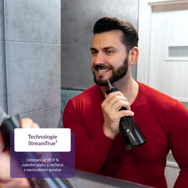 Ústní sprcha TrueLife AquaFloss Compact L100 Black nabízí mnohem pohodlnější a šetrnější způsob čištění mezizubních prostor než zubní nitě či mezizubní kartáčky. Navíc šetří peníze, protože není třeba tyto komponenty stále dokupovat. 300ml nádržku naplníte shora nebo z boku vodou, zvolíte jeden ze 3 režimů čištění a technologie StreamTrue® se postará o účinné odstranění zubního plaku, bakterií a zbytků jídel, neboť mikrobublinky vytvořené z vody a vzduchu proniknou i do nejužších prostor. Speciální režim POINT cíleně odstraní zbytky jídel třemi přesnými a rychlými střiky pod vysokým tlakem následovanými krátkou pauzou.