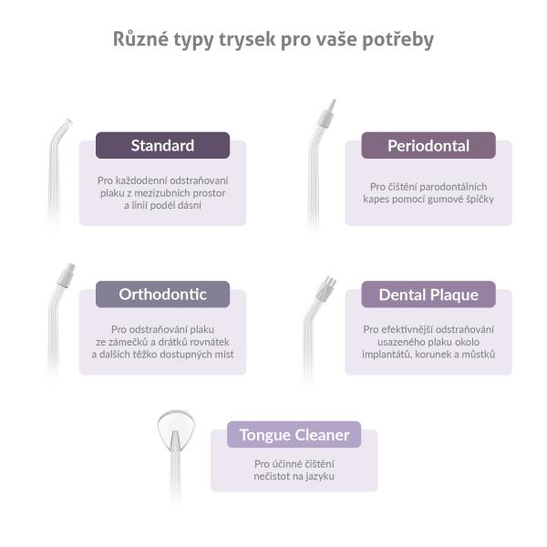 Součástí sprchy je 6 speciálních trysek (2× Standard, 1× Orthodontic, 1× Periodontal, 1× Dental Plaque, 1× Tongue Cleaner), navržené pro různé potřeby: