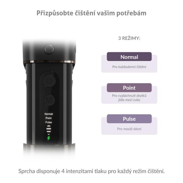 Sprcha poskytuje 3 režimy čištění s různými intenzitami tlaku (30 - 130 PSI). Normal pro běžné čištění, Point pro cílené a účinné odstranění zbytků jídla z mezizubních prostor a Pulse pro masáž dásní.