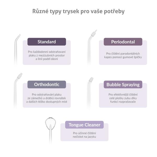Součástí sprchy je 6 speciálních trysek (2× Standard, 1× Orthodontic, 1× Periodontal, 1× Bubble Spraying, 1× Tongue Cleaner), navržené pro různé potřeby: