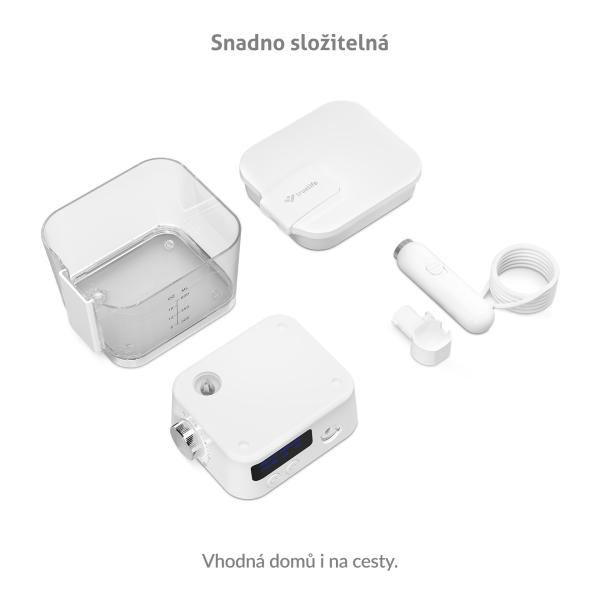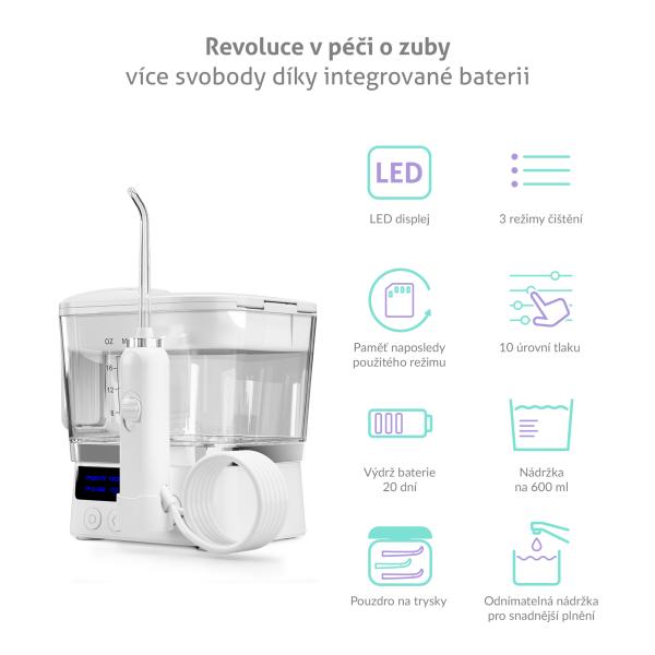 Sprcha je vybavena nádržkou o objemu 600 ml, která vystačí na celé jedno čištění ústní dutiny.