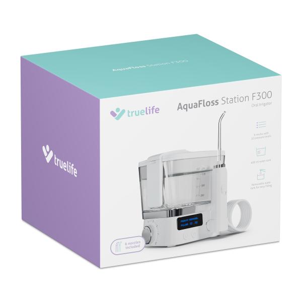 Dopřejte si kvalitní a pohodlnou dentální péči v pohodlí domova i na cestách. Ústní sprcha TrueLife AquaFloss Station F300 dokáže perfektně vyčistit hůře dostupné mezizubní prostory. Je vybavena integrovanou dobíjecí baterií, která na jedno nabití vydrží až 20 dní, což ji činí ideální pro použití nejen doma, ale i na cestách. Po použití ji celou jednoduše složíte do nádržky na vodu. Pro čištění, lze využít 3 režimy a u každého máte na výběr z 10 intenzit tlaku vody. 600 ml nádržku snadno odejmete a naplníte vodou. Sprcha je vybavena technologií StreamTrue® pro dokonalé odstranění plaku a nečistot a technologií PulseTrue® pro masáž dásní. Přehledný displej ukazuje aktuálně zvolené nastavení, funkce Paměť si zapamatuje poslední použitý režim, který po spuštění automaticky aktivuje. Díky časovači máte jistotu, že čištění probíhá doporučené 2 minuty. Šikovná je úschovna pro trysky nacházející se ve víku nádržky a hlavice otočná o 360°, s níž vyčistíte každé zákoutí úst.