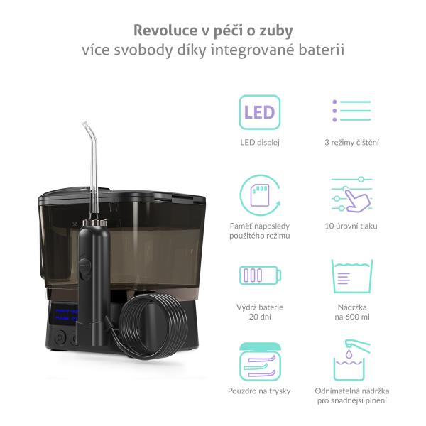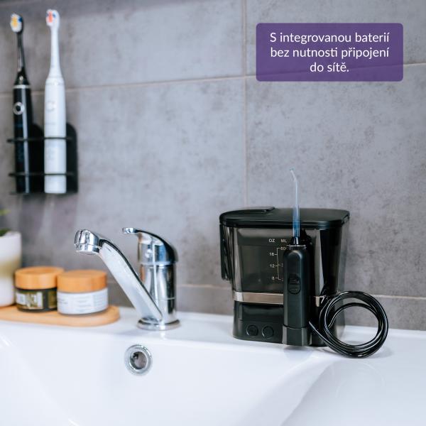Sprcha je vybavena nádržkou o objemu 600 ml, která vystačí na celé jedno čištění ústní dutiny.