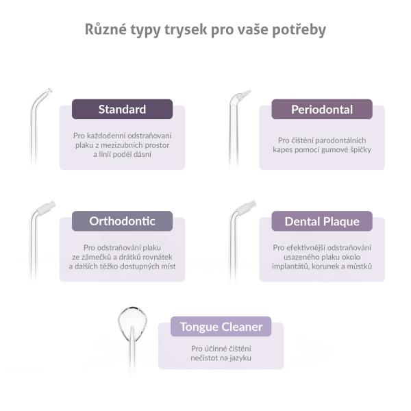 Součástí sprchy je 6 speciálních trysek (2× Standard, 1× Orthodontic, 1× Periodontal, 1× Dental Plaque, 1× Tongue Cleaner), navržené pro různé potřeby: