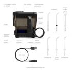 Před použitím sprchy jednoduše doplníte vodu do 600 ml nádržky, a to jejím odejmutím a naplněním. Z úschovny pro trysky ve víku nádržky vyjmete trysku, nasadíte a čistíte. Funkce Paměť si zapamatuje poslední použitý režim, který se po zapnutí automaticky aktivuje. Nastavení vidíte na přehledném displeji. Časovač ohlídá, že čištění probíhá doporučené 2 minuty, poté zařízení vypne. Díky otočné hlavici o 360° se dostanete i do těžko dostupných míst v ústech. Potřebujete-li se vydat na cesty, sprchu složíte do nádržky na vodu, která slouží jako pouzdro a je připravena jet s vámi.