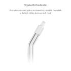 Ortodontická tryska pro odstraňování plaku ze zámečků a drátků rovnátek a dalších těžko dostupných míst.
