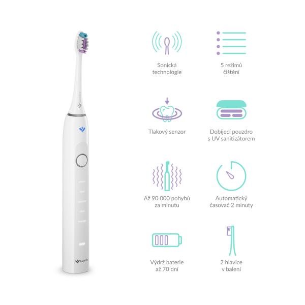 Chytré technologie pro tu nejlepší dentální péči se potkávají v TrueLife SonicBrush Clean70 UV. Sonický kartáček, který odstraňuje s výkonem až 90 000 pohybů za minutu až 12× více zubního plaku než manuální kartáček, je skutečným skvostem mezi kartáčky. Sonická technologie SonicTrue® pomocí jemných vibrací čistí plošky zubů a díky víření vody s pastou vytváří mikrobublinky čistící mezizubní prostory. Tlakový senzor s technologií SmartPressure® hlídá, abyste si přílišným tlakem na zuby a dásně nepřivodili zdravotní obtíže. Velkou službu vám prokáže také UV sterilizace ukrytá v dobíjecím pouzdře, která efektivně ničí až 99,9 % bakterií a virů z hlavice kartáčku. Hýčkat své zuby můžete doma i na cestách, a to až 70 dní na jedno nabití, pomocí 5 režimů čištění (Whiten, Clean, Sensitive, Shine, Massage) a 2 přiložených hlavic (Standard a Sensitive). Poslední použitý režim zůstává uchován v paměti a automaticky se spustí po opětovném zapnutí. Běží ideální 2 minuty, na něž je nastavený časovač.