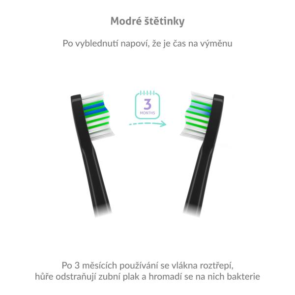 Hlavice vydrží až 3 měsíce používání, poté se začnou třepit, ztrácí účinnost a navíc se na nich hromadí bakterie. Naštěstí jsou hlavice opatřeny modrými štětinami, které po 3 měsících vyblednou a vy tak víte, že je načase hlavice vyměnit.