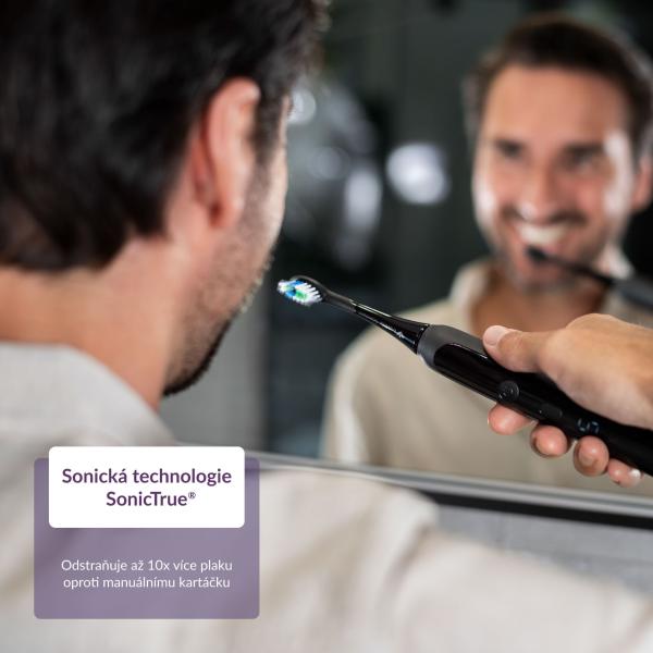 Sonická technologie SonicTrue® funguje na bázi jemných vibrací, při kterých štětiny kartáčku kmitají vysokou rychlostí a efektivně odstraňují zubní plak. 80 000 pohybů za minutu vhání vodu se zubní pastou i do mezizubních prostor a jemné vibrace nedají šanci plaku, skvrnám ani bakteriím. Sonická technologie je navíc šetrnější k zubní sklovině, než manuální čištění nebo rotační kartáčky.