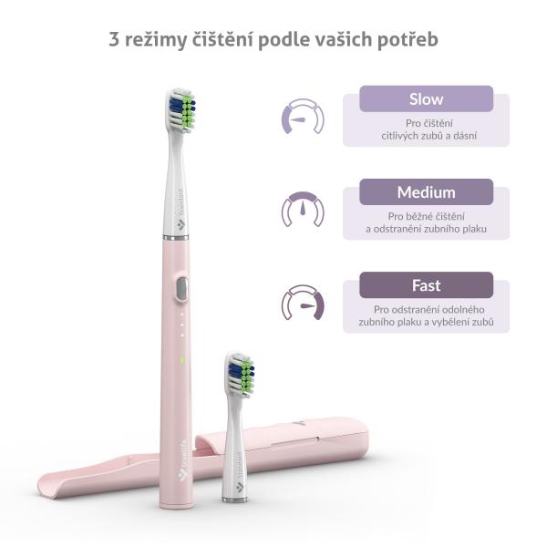 Sonický kartáček disponuje 3 režimy čištění. SLOW ocení lidé s citlivými zuby a dásněmi, MEDIUM je ideální na běžné čištění a odstranění zubního plaku, FAST odstraní i odolný zubní plak a bělí zuby.