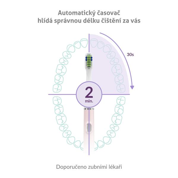 Kartáček je vybaven časovačem nastaveným na ideální 2 minuty čištění, poté se automaticky vypne.