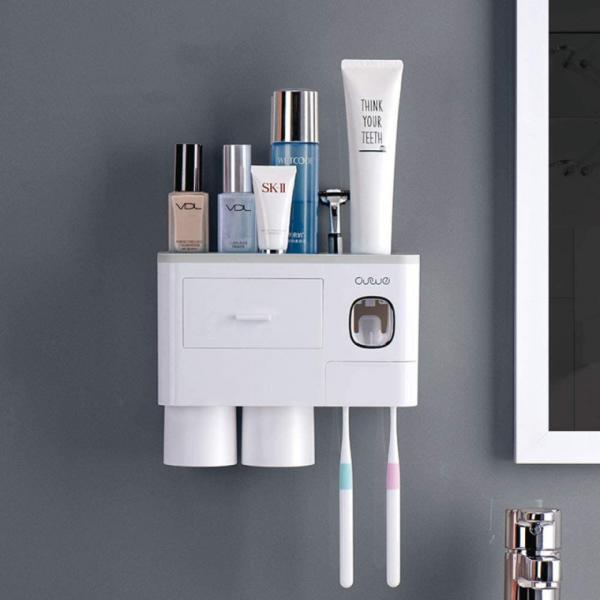 E-SHOPDržák na zubní kartáčky, automatický dávkovač zubní pasty, velký úložný prostror, kelímky jištěné magnetem. Praktické a hygienické uložení. Jednoduchá instalece na zeď.