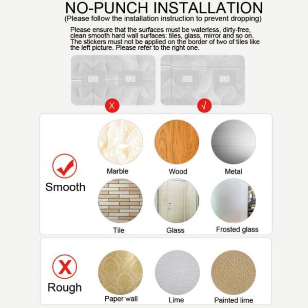 Velmi snadná instalace. Produkt snadno přichytíte na stěnu za pomoci super adhesní pásky, chrání stěnu a šetří místo v koupelně. Vezměte prosím na vědomí, že nálepka funguje pouze na površích, jako jsou kachličky, zrcadla a na hladkém dřevu. Malované stěny nejsou doporučeny.