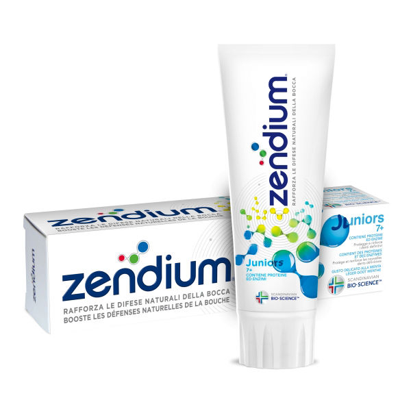 Zubní pasta Zendium JUNIOR, určená pro děti od 7-ti let, intenzivně chrání dětské zuby pomocí enzymů a proteinů, čímž zajišťuje intenzivní ochranu dětských úst.